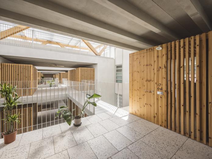 El proyecto, desarrollado por Peris Toral Arquitectes junto a Eletresjota Tècnics Associats, parte de una idea clara: organizar la complejidad del programa residencial a través de una secuencia de cinco patios interconectados por pasarelas que funcionan como calles elevadas. Esta solución no solo garantiza iluminación y ventilación natural en todas las viviendas, sino que genera espacios intermedios pensados para la relación social.