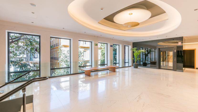 En este entorno, Orona ha incorporado un ascensor panorámico que se integra de forma armoniosa en el vestíbulo principal. La solución, con acabados en negro y vidrio, respeta la estética del edificio y aporta una presencia discreta y sofisticada. Su funcionamiento fluido facilita el tránsito del público y del personal, reforzando la accesibilidad sin alterar el carácter emblemático del teatro.