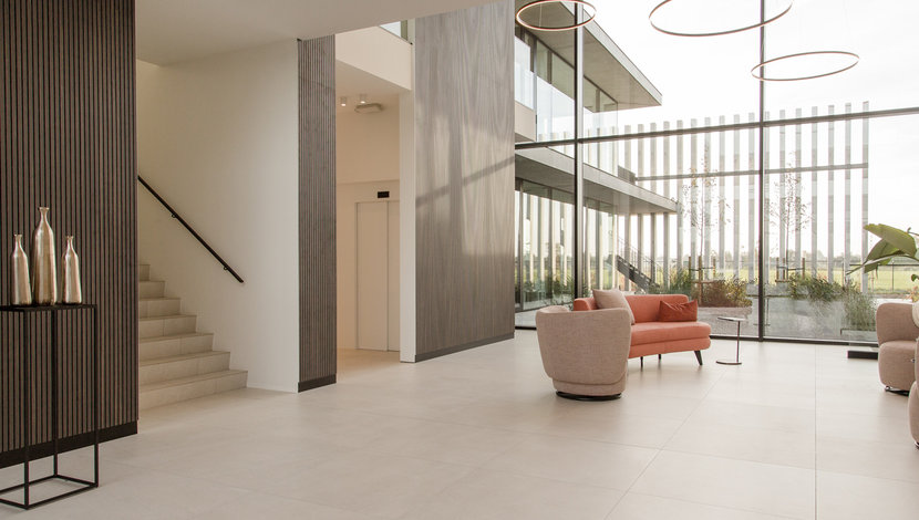 Cadcamatic is een bedrijf die gespecialiseerd is in mechatronica, met meer dan 20 jaar ervaring. In opdracht van de bouwheer en architect werd hier een lift met hefvermogen 1000 kg geplaatst met liftkooi in neocompactpanelen, achterwand volledig in spiegel met leuning op tussenplint. Vloer van de bordessen is doorgetrokken in de lift.